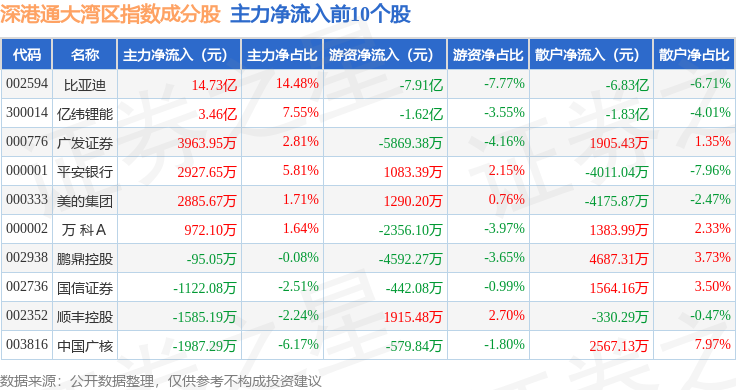 资金流向方面,深港通大湾区(983089)指数成份股当日主力资金净流出合计7.37亿元,游资资金净流出合计5941.77万元,散户资金净流入合计7.97亿元。成份股资金流向详情见下表: