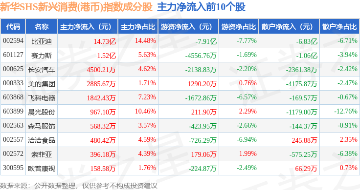 资金流向方面,新华SHS新兴消费(港币)(989007)指数成份股当日主力资金净流入合计11.8亿元,游资资金净流出合计7.16亿元,散户资金净流出合计4.65亿元。成份股资金流向详情见下表: