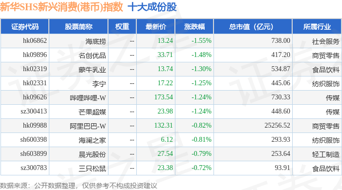 新华SHS新兴消费(港币)(989007)指数十大成份股详情如下: