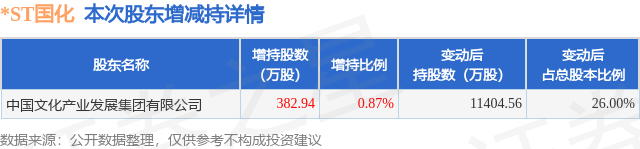 证券之星消息,12月26日*ST国化发布公告《*ST国化:国新文化控股股份有限公司关于控股股东权益变动触及1%刻度的提示性公告》,其股东中国文化产业发展集团有限公司于2025年12月11日至2025年12月25日间合计增持382.94万股,占公司目前总股本的0.873%,变动期间该股股价上涨5.96%,截止12月25日收盘报8.71元。