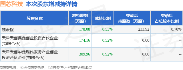 证券之星消息,12月26日国芯科技发布公告《国芯科技:关于持股5%以下的股东减持计划完成暨减持股份结果公告》,其股东天津天创保鑫创业投资合伙企业(有限合伙)、魏宏锟、天津天创华鑫现代服务产业创业投资合伙企业(有限合伙)于2025年9月30日至2025年12月25日间合计减持662.2万股,占公司目前总股本的1.9708%,变动期间该股股价下跌3.35%,截止12月25日收盘报29.44元。
