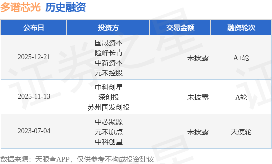 证券之星消息,根据天眼查APP于12月21日公布的信息整理,苏州多谱芯光科技有限公司A+轮融资,融资额未披露,参与投资的机构包括国晟资本,险峰长青,中新资本,元禾控股。