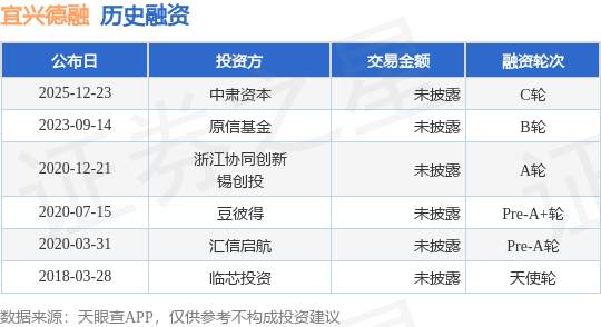 证券之星消息,根据天眼查APP于12月23日公布的信息整理,江苏宜兴德融科技有限公司C轮融资,融资额未披露,参与投资的机构包括中肃资本。