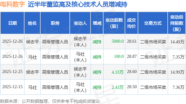 证券之星消息,根据12月26日市场公开信息、上市公司公告及交易所披露数据整理,电科数字(600850)最新董监高及相关人员股份变动情况:2025年12月25日至2025年12月26日公司高级管理人员侯志平、高级管理人员马壮共减持公司股份4.84万股,占公司总股本为0.0072%。变动期间公司股价上涨8.95%,12月26日当日收盘报30.55元。