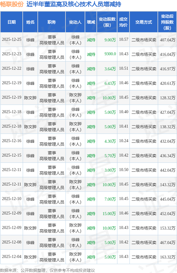 畅联股份近半年内的董监高及核心技术人员增减持详情如下: