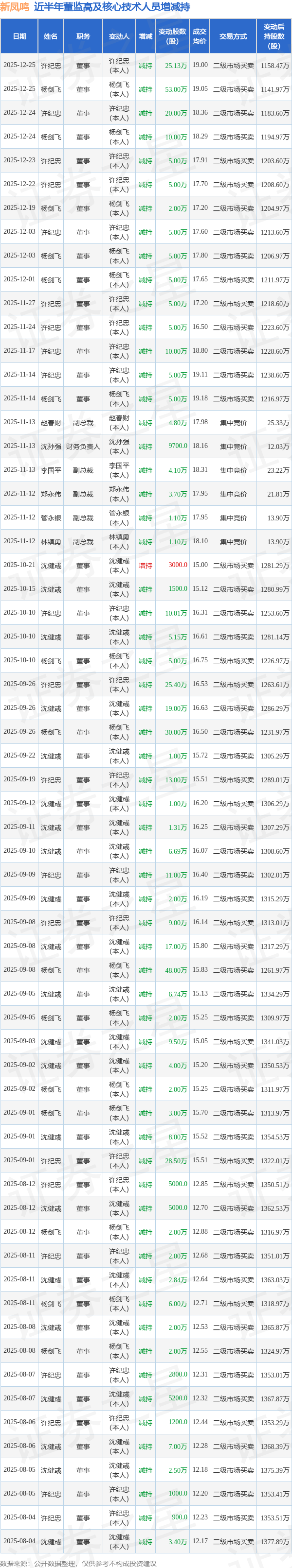 新凤鸣近半年内的董监高及核心技术人员增减持详情如下: