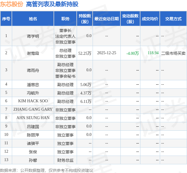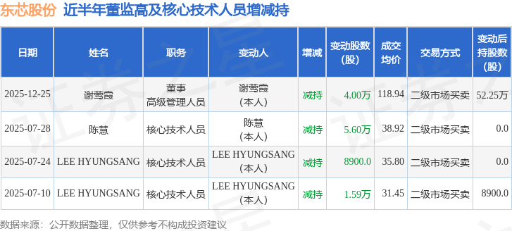 东芯股份近半年内的董监高及核心技术人员增减持详情如下: