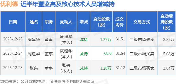 证券之星消息,根据12月26日市场公开信息、上市公司公告及交易所披露数据整理,优利德(688628)最新董监高及相关人员股份变动情况:2025年12月25日公司董事周建华共减持公司股份1.27万股,占公司总股本为0.0113%。变动期间公司股价上涨0.73%,12月25日当日收盘报31.73元。