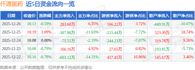 证券之星消息,截至2025年12月26日收盘,仟源医药(300254)报收于10.13元,下跌0.59%,换手率1.95%,成交量4.38万手,成交额4469.04万元。