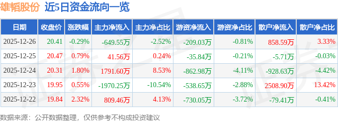 证券之星消息,截至2025年12月26日收盘,雄韬股份(002733)报收于20.41元,下跌0.29%,换手率3.41%,成交量12.56万手,成交额2.58亿元。