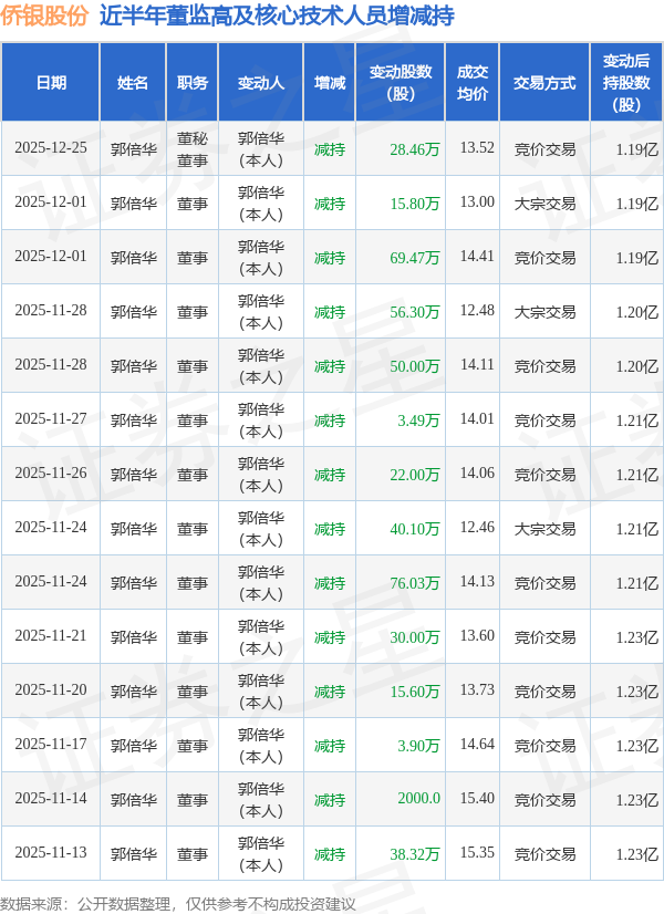 侨银股份近半年内的董监高及核心技术人员增减持详情如下: