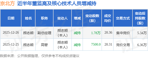 证券之星消息,根据12月26日市场公开信息、上市公司公告及交易所披露数据整理,京北方(002987)最新董监高及相关人员股份变动情况:2025年12月25日公司高管颜志顺共减持公司股份7500.0股,占公司总股本为0.0009%。变动期间公司股价上涨4.7%,12月25日当日收盘报20.29元。