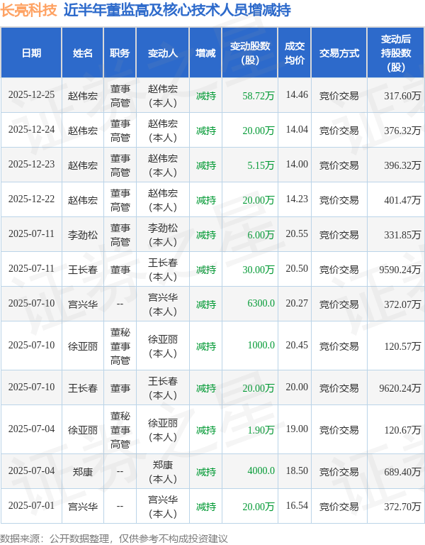 长亮科技近半年内的董监高及核心技术人员增减持详情如下:
