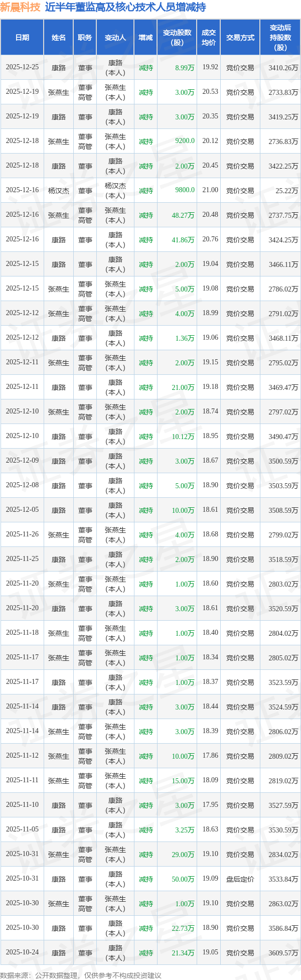 新晨科技近半年内的董监高及核心技术人员增减持详情如下: