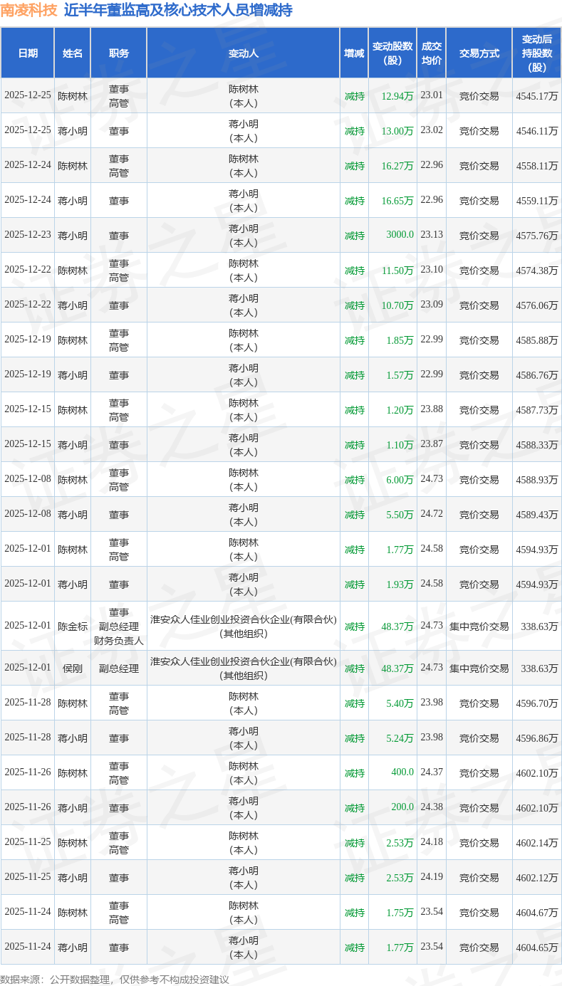 南凌科技近半年内的董监高及核心技术人员增减持详情如下: