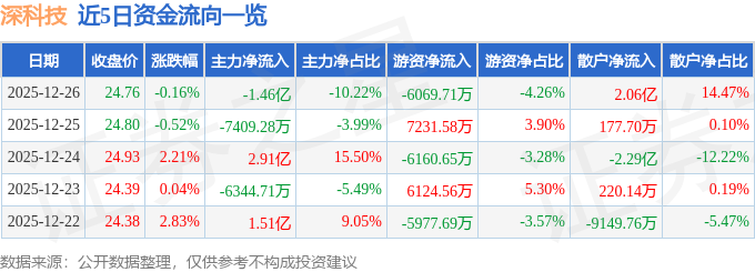 证券之星消息,截至2025年12月26日收盘,深科技(000021)报收于24.76元,下跌0.16%,换手率3.65%,成交量57.41万手,成交额14.26亿元。