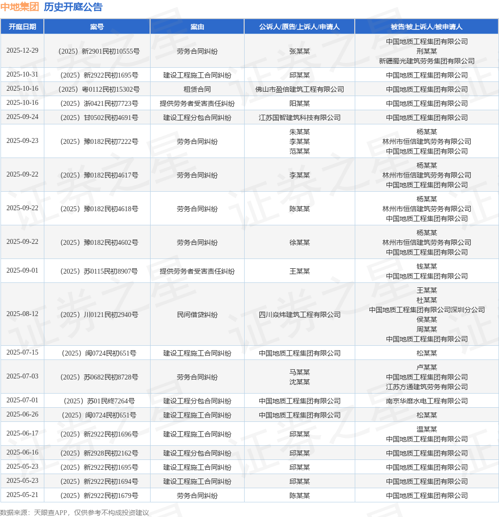 案号:(2025)新2901民初10555号根据统计,近一年内以中国地质工程集团有限公司为当事人的历史开庭公告有24则,其中案由为“劳务合同纠纷”的公告以8则居首,其次为“建设工程施工合同纠纷”有6则,“建设工程分包合同纠纷”有5则。历史开庭公告(前20条)如下:
