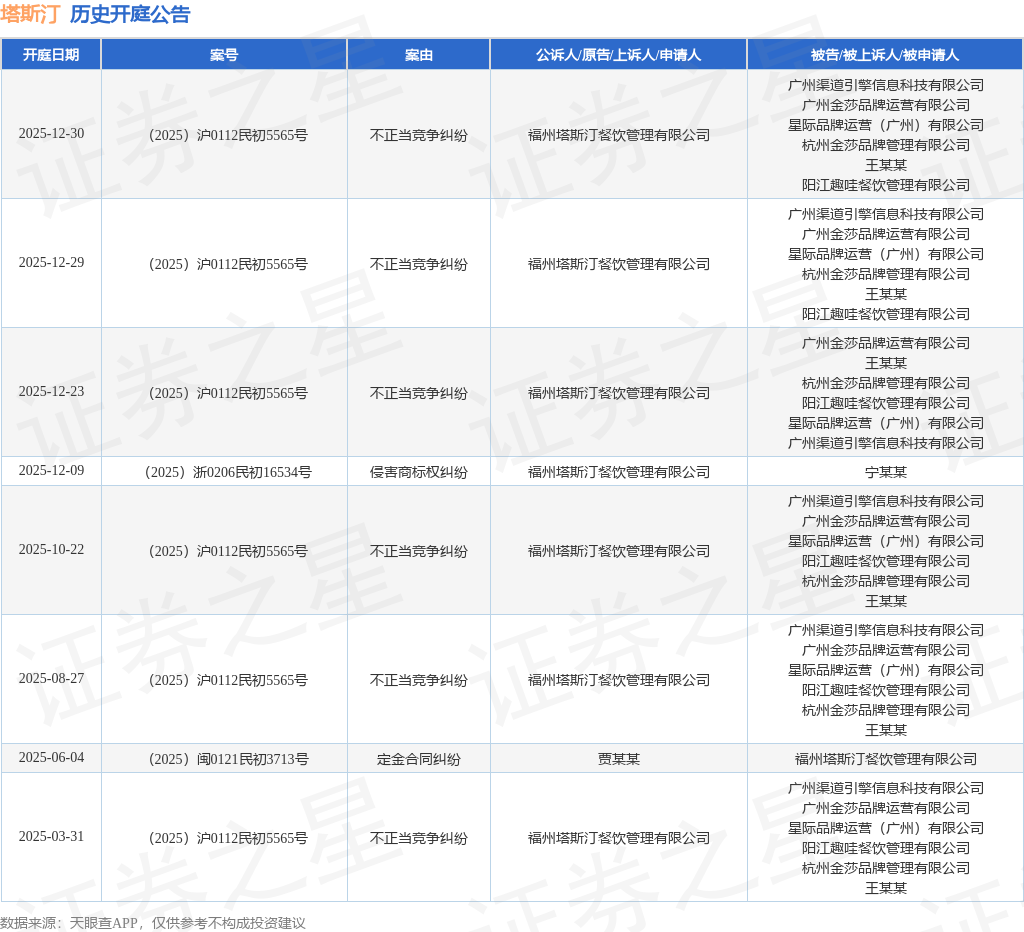 案号:(2025)沪0112民初5565号根据统计,近一年内以福州塔斯汀餐饮管理有限公司为当事人的历史开庭公告有8则,其中案由为“不正当竞争纠纷”的公告以6则居首,其次为“侵害商标权纠纷”有1则,“定金合同纠纷”有1则。历史开庭公告如下: