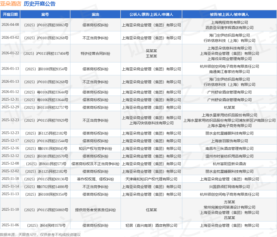 案号:(2025)浙0110民初32757号根据统计,近一年内以上海亚朵商业管理(集团)有限公司为当事人的历史开庭公告有95则,其中案由为“侵害商标权纠纷”的公告以55则居首,其次为“不正当竞争纠纷”有9则,“知识产权与竞争纠纷”有6则。历史开庭公告(前20条)如下: