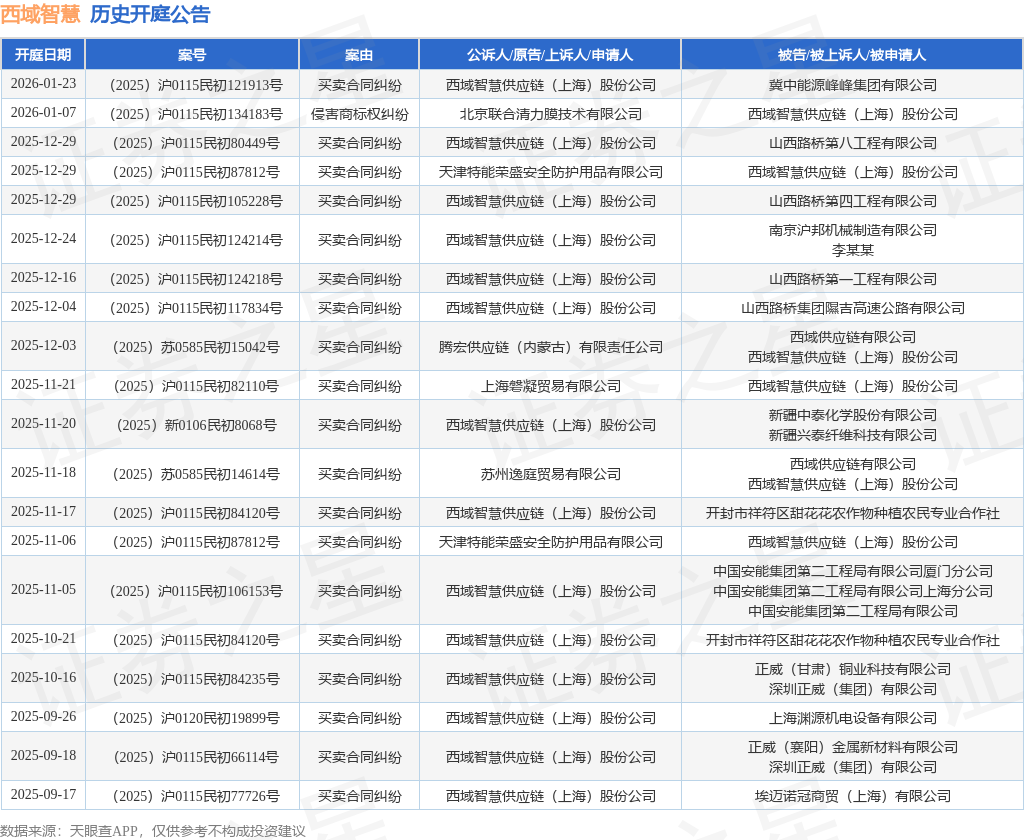 案号:(2025)沪0115民初87812号根据统计,近一年内以西域智慧供应链(上海)股份公司为当事人的历史开庭公告有70则,其中案由为“买卖合同纠纷”的公告以69则居首,其次为“侵害商标权纠纷”有1则。历史开庭公告(前20条)如下: