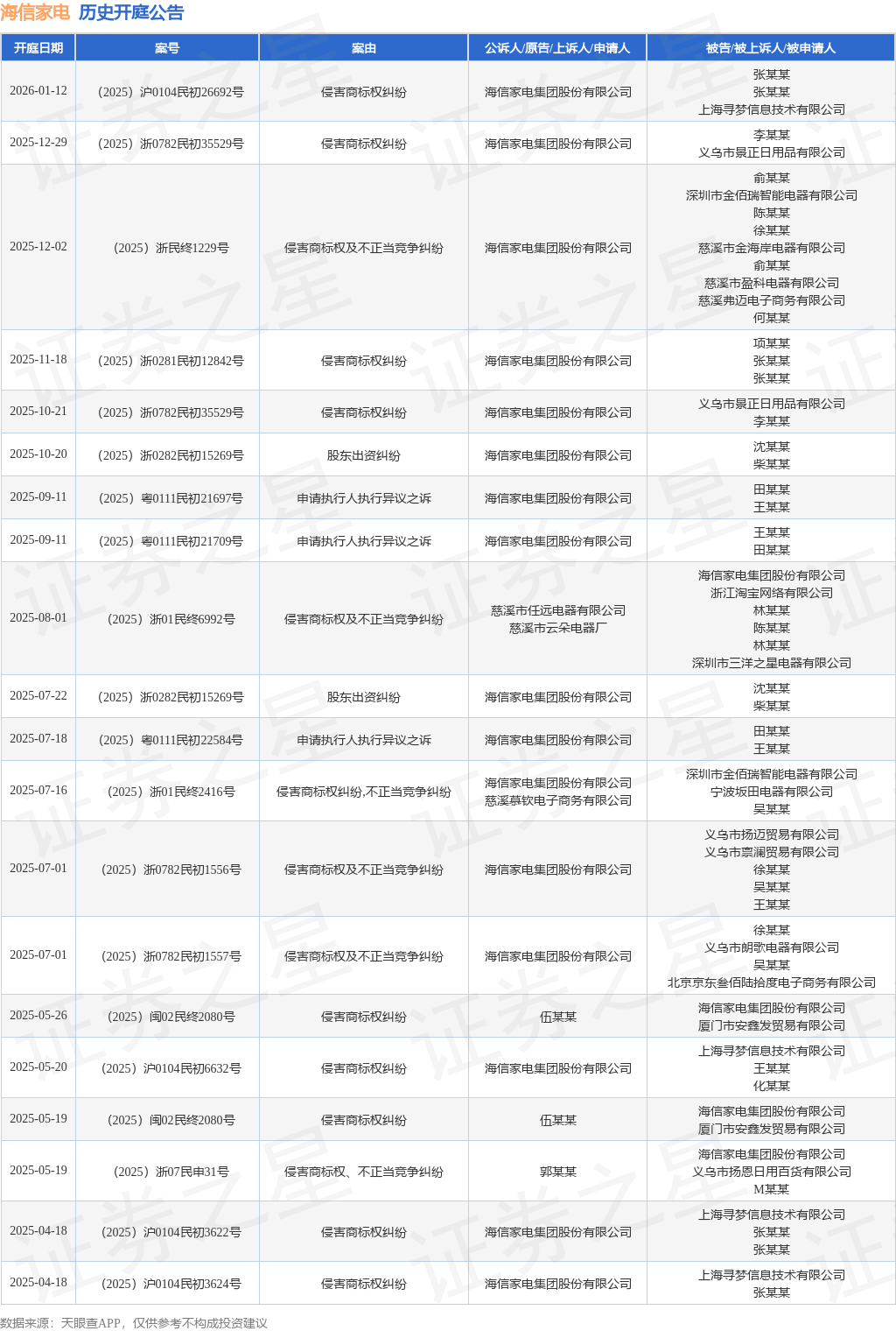 案号:(2025)浙0782民初35529号根据统计,近一年内以海信家电集团股份有限公司为当事人的历史开庭公告有33则,其中案由为“侵害商标权纠纷”的公告以19则居首,其次为“侵害商标权及不正当竞争纠纷”有4则,“申请执行人执行异议之诉”有3则。历史开庭公告(前20条)如下: