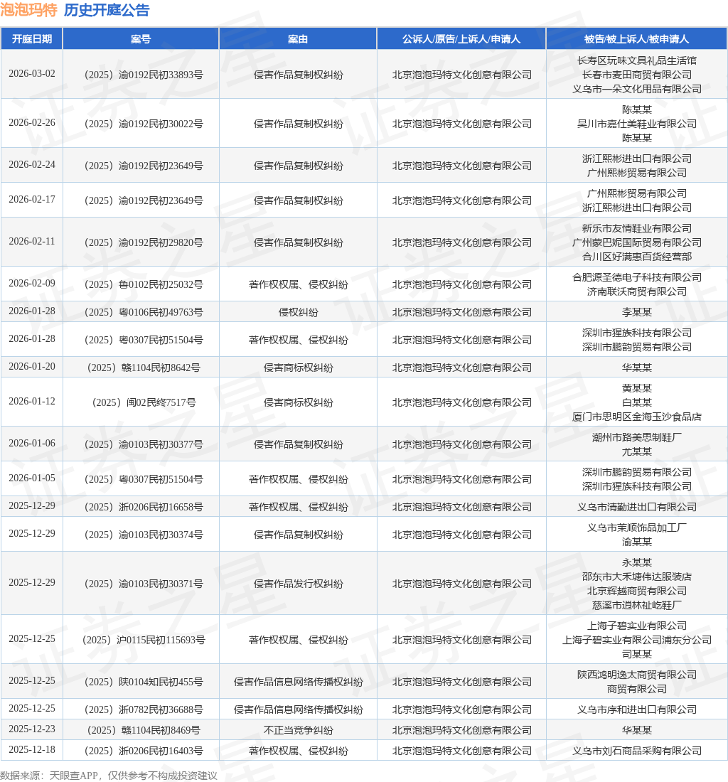 案号:(2025)渝0103民初30374号根据统计,近一年内以北京泡泡玛特文化创意有限公司为当事人的历史开庭公告有93则,其中案由为“著作权权属、侵权纠纷”的公告以30则居首,其次为“侵害作品复制权纠纷”有21则,“侵害商标权纠纷”有13则。历史开庭公告(前20条)如下: