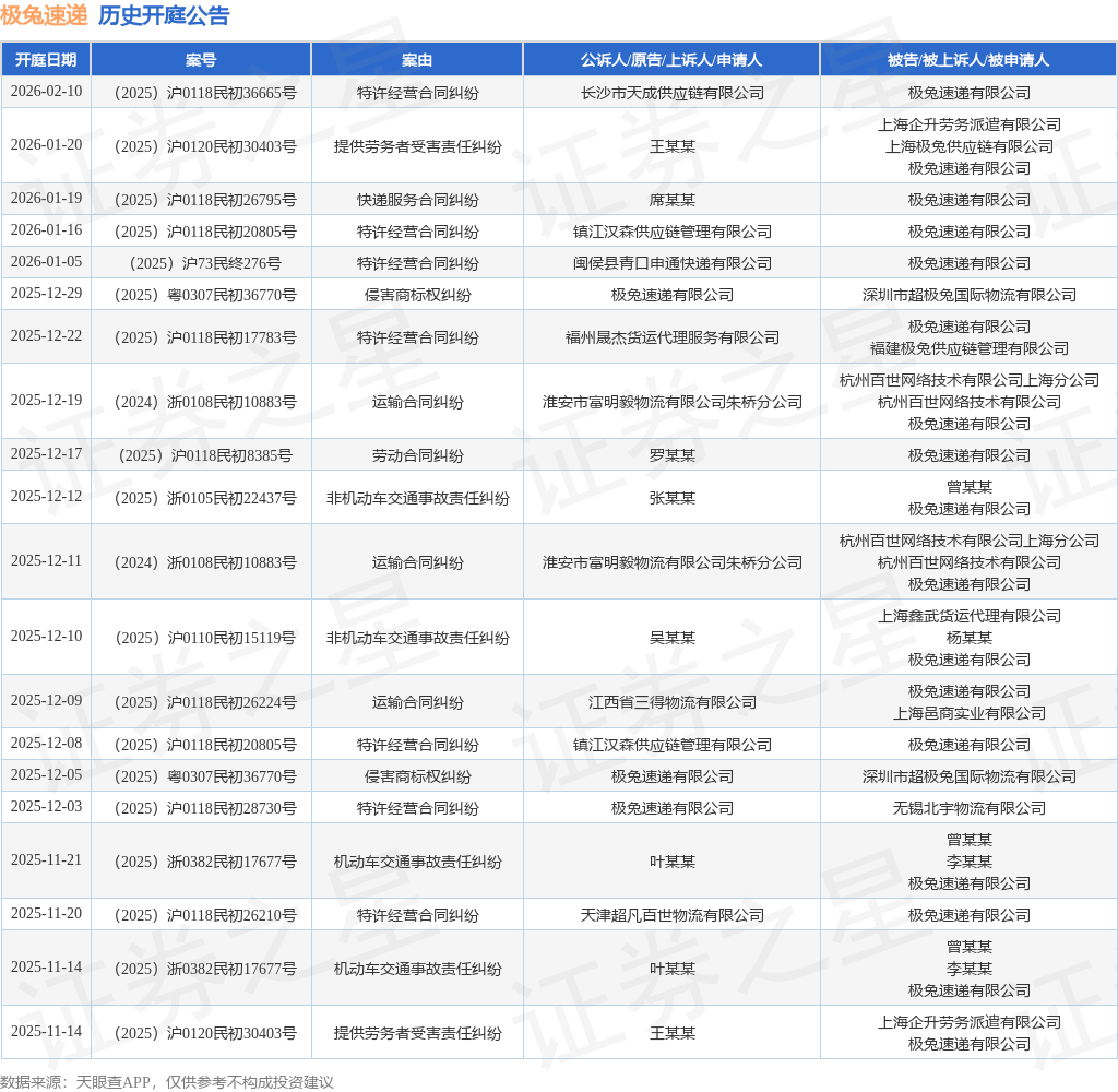 案号:(2025)粤0307民初36770号根据统计,近一年内以极兔速递有限公司为当事人的历史开庭公告有142则,其中案由为“特许经营合同纠纷”的公告以57则居首,其次为“快递服务合同纠纷”有17则,“运输合同纠纷”有11则。历史开庭公告(前20条)如下: