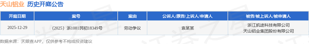 根据统计,近一年内以天山铝业集团股份有限公司为当事人的历史开庭公告有1则,其中案由为“劳动争议”的公告以1则居首。历史开庭公告如下: