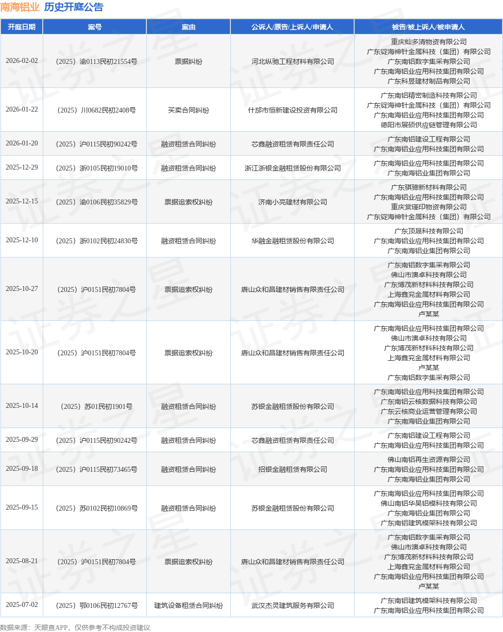 案号:(2025)浙0105民初19010号根据统计,近一年内以广东南海铝业应用科技集团有限公司为当事人的历史开庭公告有14则,其中案由为“融资租赁合同纠纷”的公告以7则居首,其次为“票据追索权纠纷”有4则,“买卖合同纠纷”有1则。历史开庭公告如下:
