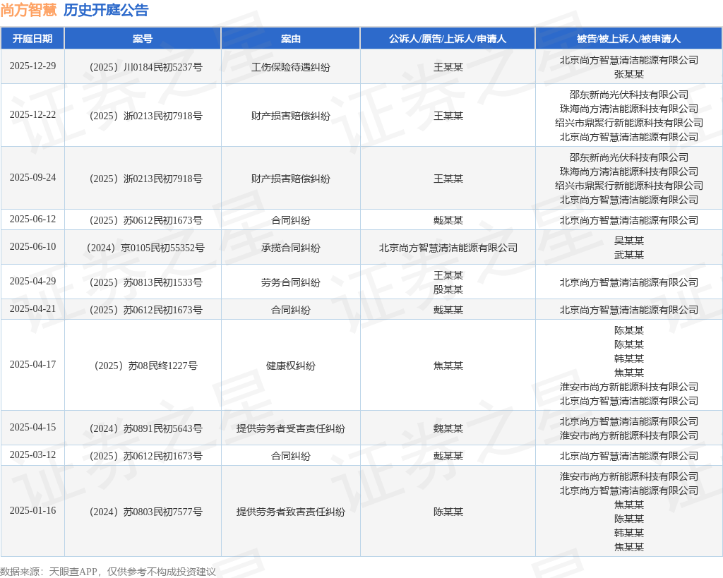 案号:(2025)川0184民初5237号根据统计,近一年内以北京尚方智慧清洁能源有限公司为当事人的历史开庭公告有11则,其中案由为“合同纠纷”的公告以3则居首,其次为“财产损害赔偿纠纷”有2则,“健康权纠纷”有1则。历史开庭公告如下: