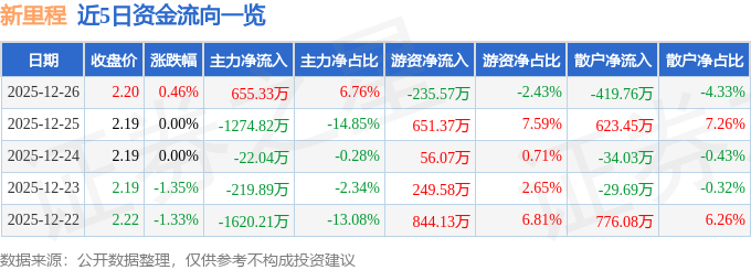 证券之星消息,截至2025年12月26日收盘,新里程(002219)报收于2.2元,上涨0.46%,换手率1.35%,成交量44.09万手,成交额9698.96万元。