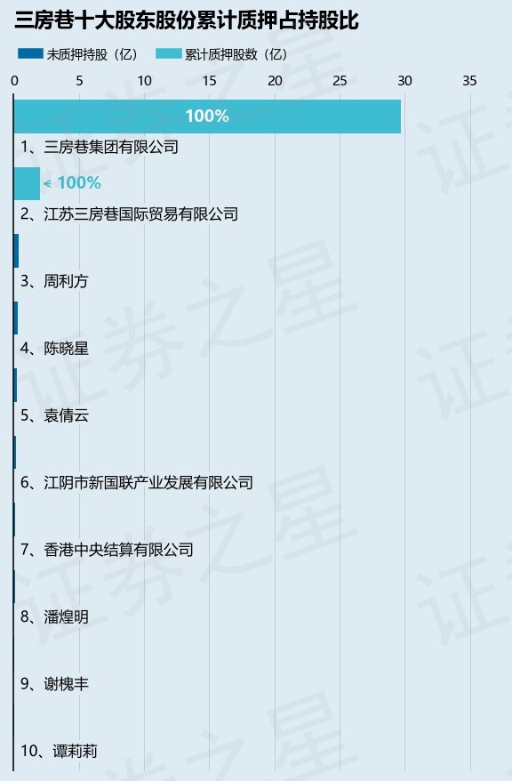 截止本公告日,股东三房巷集团有限公司已累计质押股份29.67亿股,占其持股总数的100.0%,股东江苏三房巷国际贸易有限公司已累计质押股份2.0亿股,占其持股总数的100.0%。本次质押后三房巷十大股东的累计质押股份占持股比例(占持股比例的计算以公司最新一期财务报表公布的十大股东的持股总数为基准)见下图: