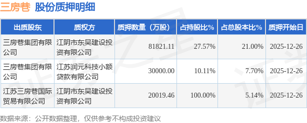 证券之星消息,三房巷(600370)12月27日公开信息显示,股东三房巷集团有限公司、江苏三房巷国际贸易有限公司向江阴市东吴建设投资有限公司、江苏润元科技小额贷款有限公司合计质押13.18亿股,占总股本33.84%。质押详情见下表: