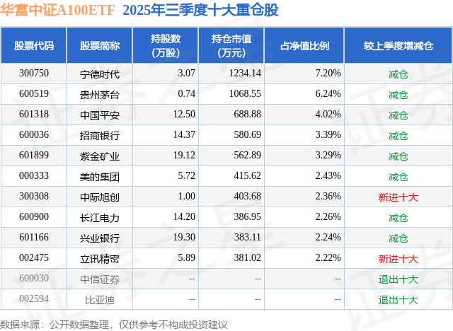 华富中证A100ETF基金成立于2025年1月15日,基金经理为李孝华,基金跟踪标的为中证A100指数,成立以来超额回报为3.66%,近一个月超额回报为0.53%。最新披露的基金持仓数据显示,截止2025年9月30日,该基金第一大重仓股为宁德时代(300750),持股占比为7.2%。