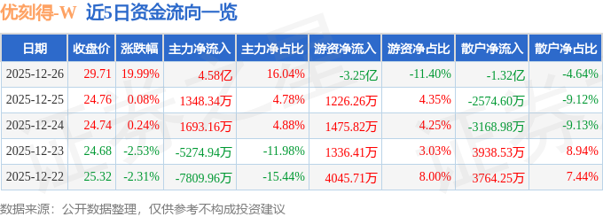 证券之星消息,截至2025年12月26日收盘,优刻得(688158)报收于29.71元,上涨19.99%,涨停,换手率24.63%,成交量99.87万手,成交额28.54亿元。