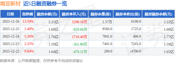 南亚新材融资融券信息显示,融资方面,当日融资买入1.07亿元,融资偿还5445.61万元,融资净买入5298.16万元。融券方面,融券卖出6100.0股,融券偿还0.0股,融券余量1.57万股,融券余额127.51万元。融资融券余额2.22亿元。