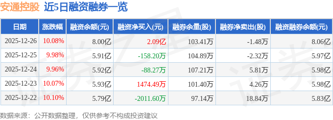 证券之星消息,截至2025年12月26日收盘,安通控股(600179)报收于6.55元,上涨10.08%,已连续涨停5天,换手率15.41%,成交量595.09万手,成交额37.44亿元。