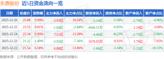 证券之星消息,截至2025年12月26日收盘,永鼎股份(600105)报收于25.88元,上涨9.99%,涨停,换手率15.37%,成交量224.7万手,成交额56.22亿元。