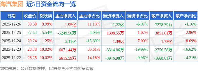 证券之星消息,截至2025年12月26日收盘,海汽集团(603069)报收于30.38元,上涨9.99%,涨停,换手率18.75%,成交量59.25万手,成交额17.49亿元。
