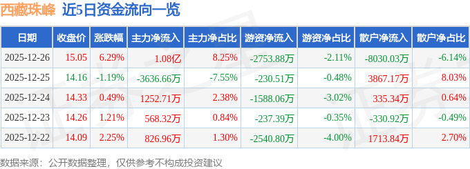 证券之星消息,截至2025年12月26日收盘,西藏珠峰(600338)报收于15.05元,上涨6.29%,换手率9.66%,成交量88.32万手,成交额13.08亿元。