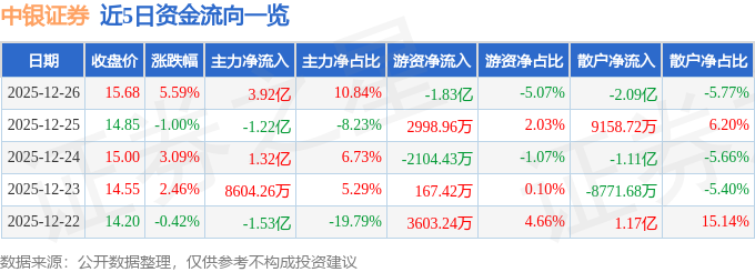 证券之星消息,截至2025年12月26日收盘,中银证券(601696)报收于15.68元,上涨5.59%,换手率8.31%,成交量230.77万手,成交额36.17亿元。