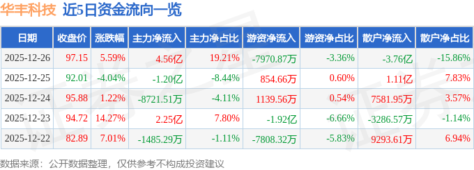 证券之星消息,截至2025年12月26日收盘,华丰科技(688629)报收于97.15元,上涨5.59%,换手率13.61%,成交量24.74万手,成交额23.73亿元。