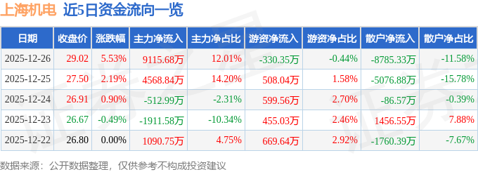 证券之星消息,截至2025年12月26日收盘,上海机电(600835)报收于29.02元,上涨5.53%,换手率3.26%,成交量26.32万手,成交额7.59亿元。