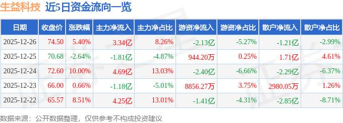 证券之星消息,截至2025年12月26日收盘,生益科技(600183)报收于74.5元,上涨5.4%,换手率2.35%,成交量56.18万手,成交额40.45亿元。