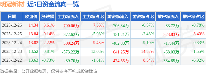 证券之星消息,截至2025年12月26日收盘,明冠新材(688560)报收于14.34元,上涨3.61%,换手率3.75%,成交量7.56万手,成交额1.07亿元。