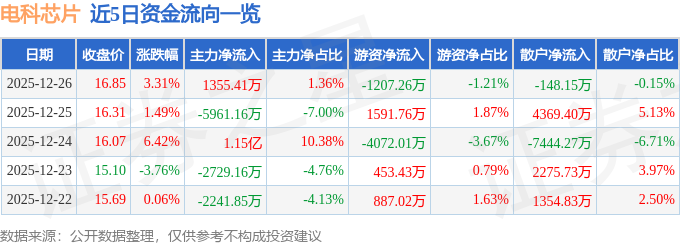 证券之星消息,截至2025年12月26日收盘,电科芯片(600877)报收于16.85元,上涨3.31%,换手率5.01%,成交量59.35万手,成交额9.98亿元。