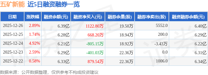 五矿新能融资融券信息显示,融资方面,当日融资买入7137.54万元,融资偿还6014.74万元,融资净买入1122.8万元。融券方面,融券卖出1.62万股,融券偿还1.06万股,融券余量19.5万股,融券余额152.48万元。融资融券余额6.4亿元。