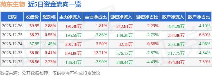 证券之星消息,截至2025年12月26日收盘,苑东生物(688513)报收于59.95元,上涨2.88%,换手率1.01%,成交量1.78万手,成交额1.06亿元。
