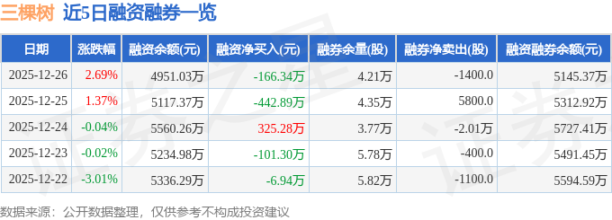 三棵树融资融券信息显示,融资方面,当日融资买入315.56万元,融资偿还481.89万元,融资净偿还166.34万元。融券方面,融券卖出1800.0股,融券偿还3200.0股,融券余量4.21万股,融券余额194.34万元。融资融券余额5145.37万元。
