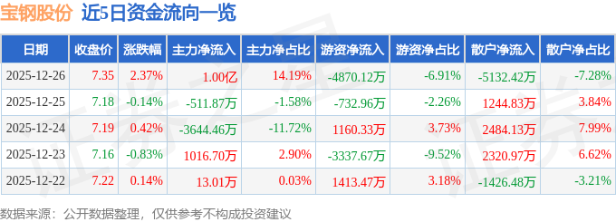 证券之星消息,截至2025年12月26日收盘,宝钢股份(600019)报收于7.35元,上涨2.37%,换手率0.44%,成交量96.75万手,成交额7.05亿元。